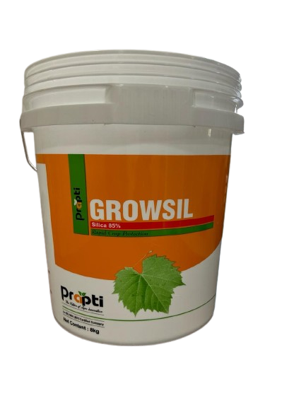 GROWSIL is a specialized crop supplement enriched with silicon, designed to enhance plant health, productivity, and quality. It strengthens plants’ natural resistance to various fungal and bacterial diseases while improving the uptake of essential nutrients like phosphorus and potassium. By boosting photosynthetic activity, GROWSIL increases chlorophyll production, leading to healthier, more vigorous growth. It enhances the shelf life, shine, and overall quality of fruits and vegetables, reduces transpiration rates, and helps control sucking pest attacks. With its multi-benefit action, GROWSIL supports stronger plants, better yields, and improved crop quality from field to market.