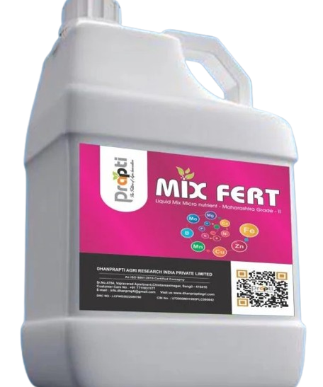 Mix Fert is a balanced micronutrient formulation containing zinc (Zn), copper (Cu), manganese (Mn), iron (Fe), boron (B), and molybdenum (Mo) in the right proportions to meet the complete micronutrient requirements of plants. While needed in smaller quantities than primary nutrients, these elements are essential for balanced crop nutrition and directly influence plant growth, development, and productivity. Mix Fert helps prevent micronutrient deficiencies, supports vital physiological processes, and improves overall plant health. Suitable for a wide range of crops including grapes, pomegranate, sugarcane, orange, cotton, paddy, tea, chilli, tomato, capsicum, banana, papaya, flowers, legumes, cereals, and fiber crops, it ensures healthy growth and better yields across diverse farming conditions.